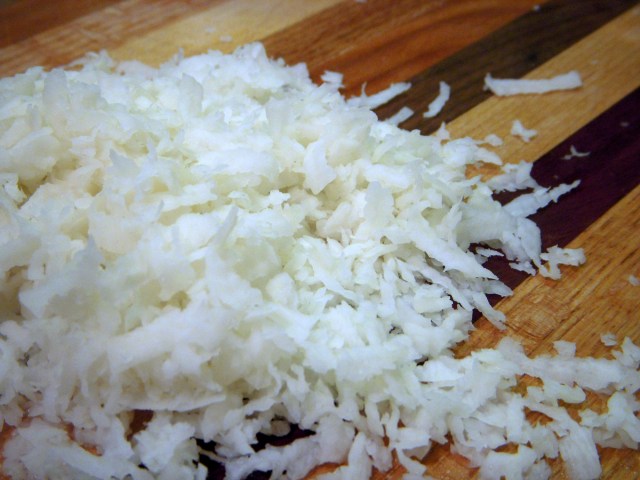 I boiled diced potatoes, drained them once they were just tender, and grated up my black radish. I tossed them both together with a little bit of Japanese mayo, salt and pepper, and served it up on a bed of greens. It was simple and tasty, and the black radish provided the perfect amount of spicy bite to the salad.