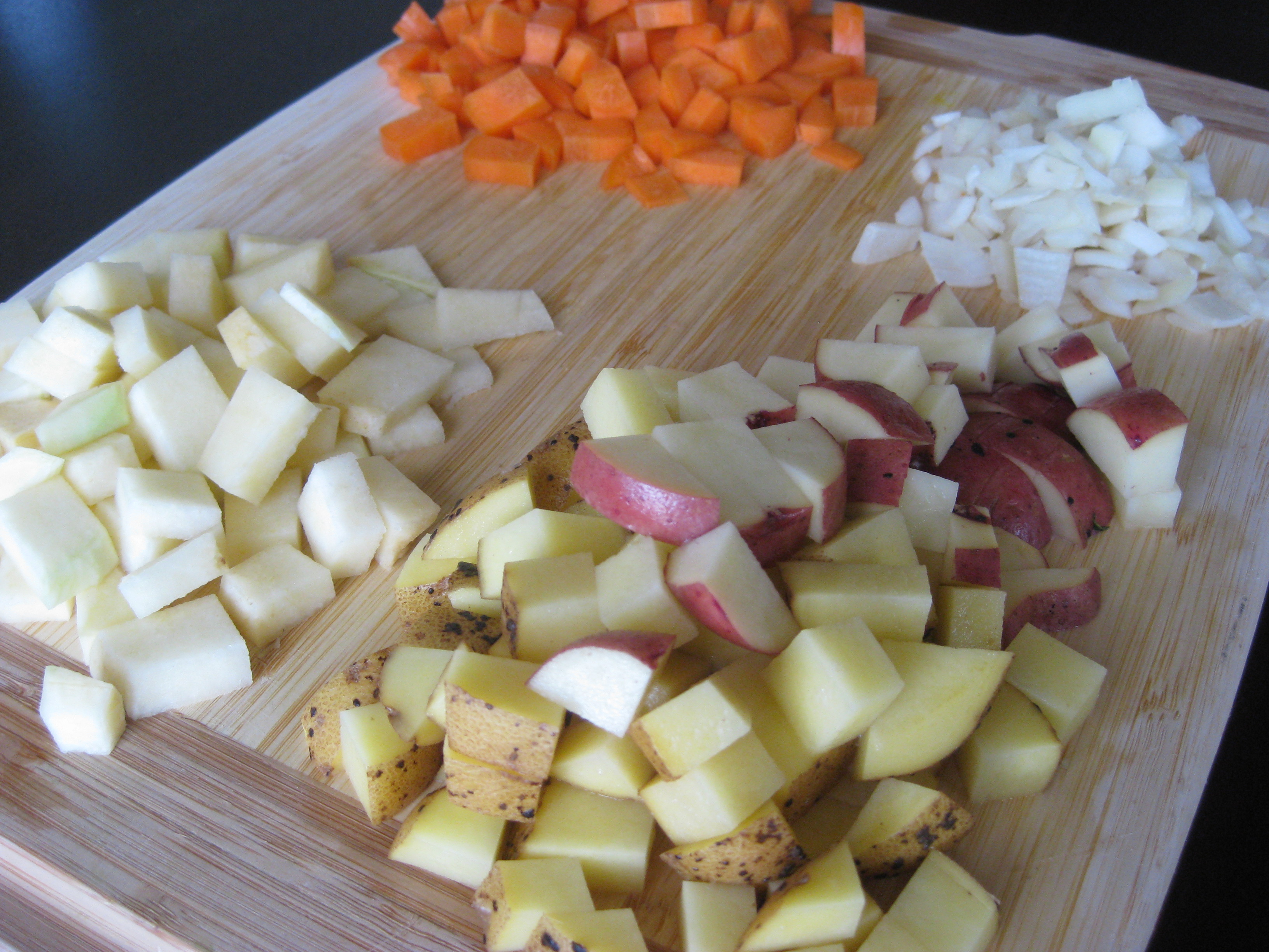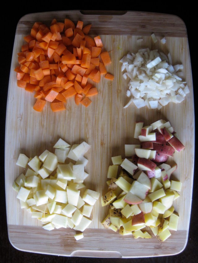 Just dice carrots, potatoes, onions and rutabagas and mix together. Traditional pasties have beef or sometimes venison, which you would also dice finely and mix with the vegetables, but I’m a vegetarian, so just the veggies for me.