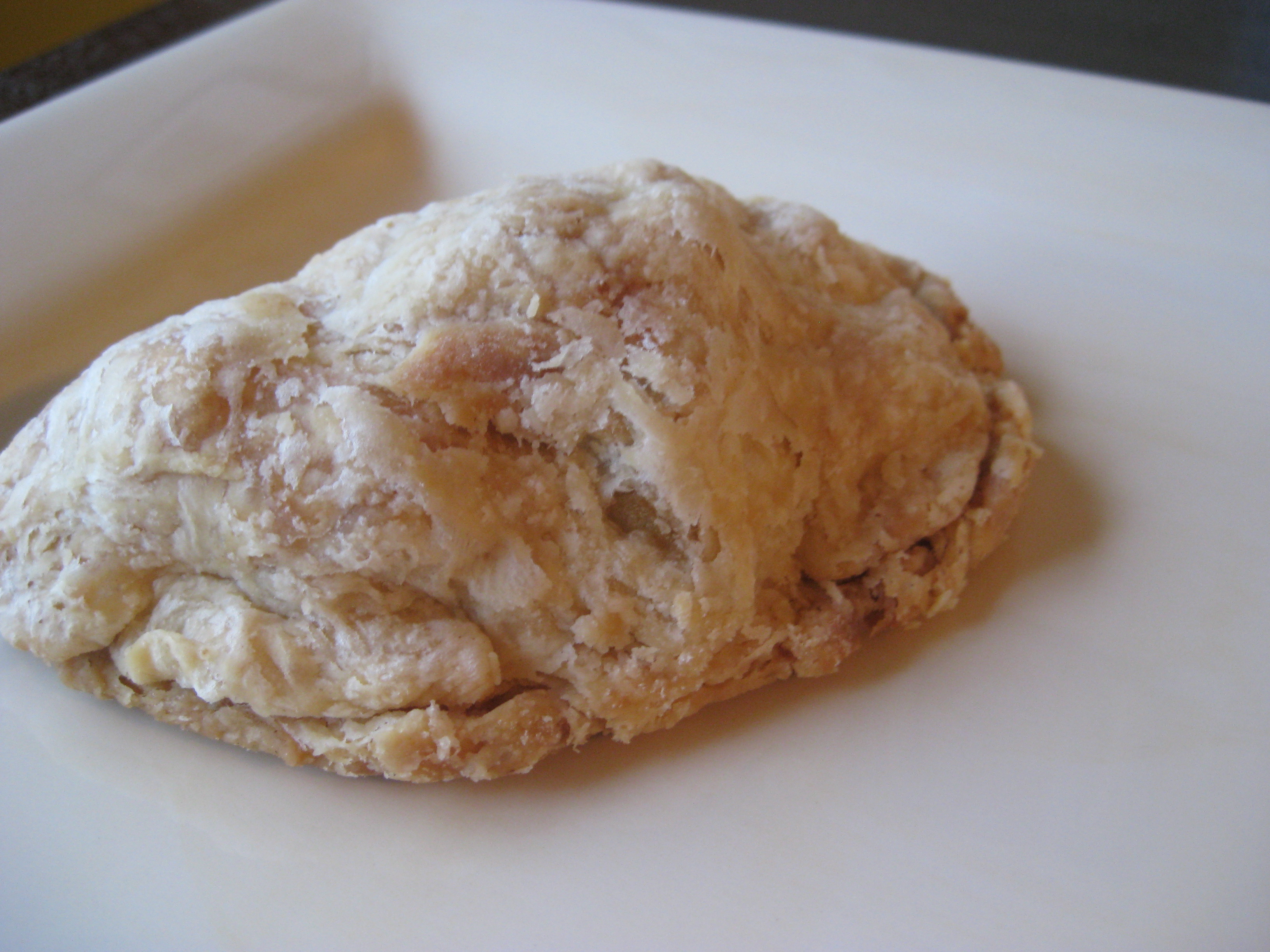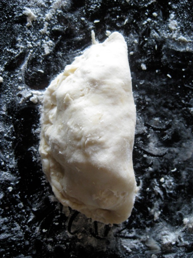 Make some simple dough – I used a recipe from here. Roll out your dough, fill with vegetables, and crimp edges closed. Like so: