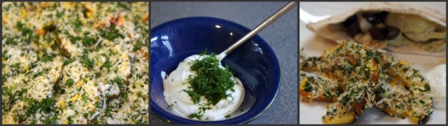 The crust mixture gets evenly spread out across the squash slices, and lightly patted down (so it sticks to the oil) and then the squash is baked until it is soft and the crust is golden and toasty. The crusted wedges are served with sour cream mixed with freshly topped dill. The wedges were tasty – the soft squash paired with the stuffing-esque crust and a dollop of sour cream reminded me of Thanksgiving, and made for a nice winter lunch.