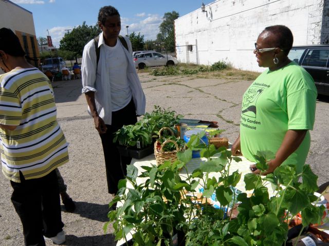 In June, Jerry worked with a couple other CDC’s to organize an eco-fair at the Vanguard CDC. Jerry and the Greening of Detroit both had tables and were handing out seeds, compost, and containers and were instructing people on growing vegetables and herbs at their own homes. People were extraordinarily responsive and were very excited to go home and plant their seeds. Most of them said they knew nothing at all about gardening and never would have thought of doing this without the information provided at the fair. Meanwhile, the Healing Support Network was there giving healthy cooking demonstrations and handing out food samples. Community members who came to the eco fair left not only with full stomachs, but with a collection of new, useful information and the opportunity to begin a more economically and environmentally sustainable and healthy lifestyle.