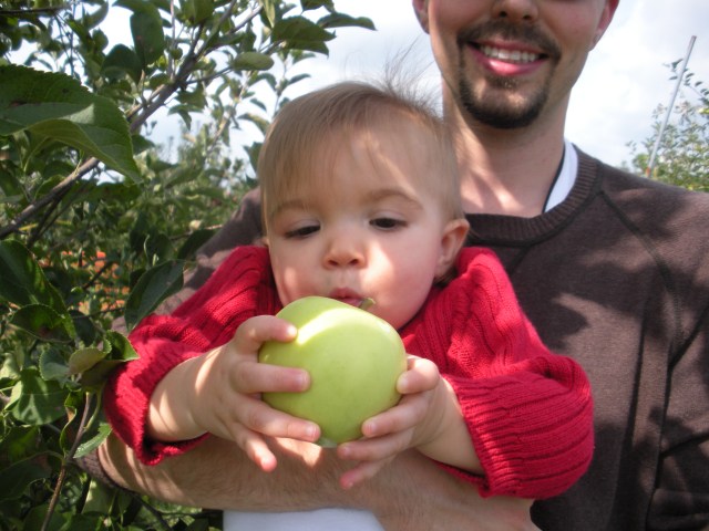 After about the ten thousandth reading of the book (I can still quote it from memory!), something clicked in my brain: Why not take her to a real apple orchard and live out the “Apples, Apples” book? So we packed her up one sunny fall day and headed out to a nearby apple orchard.