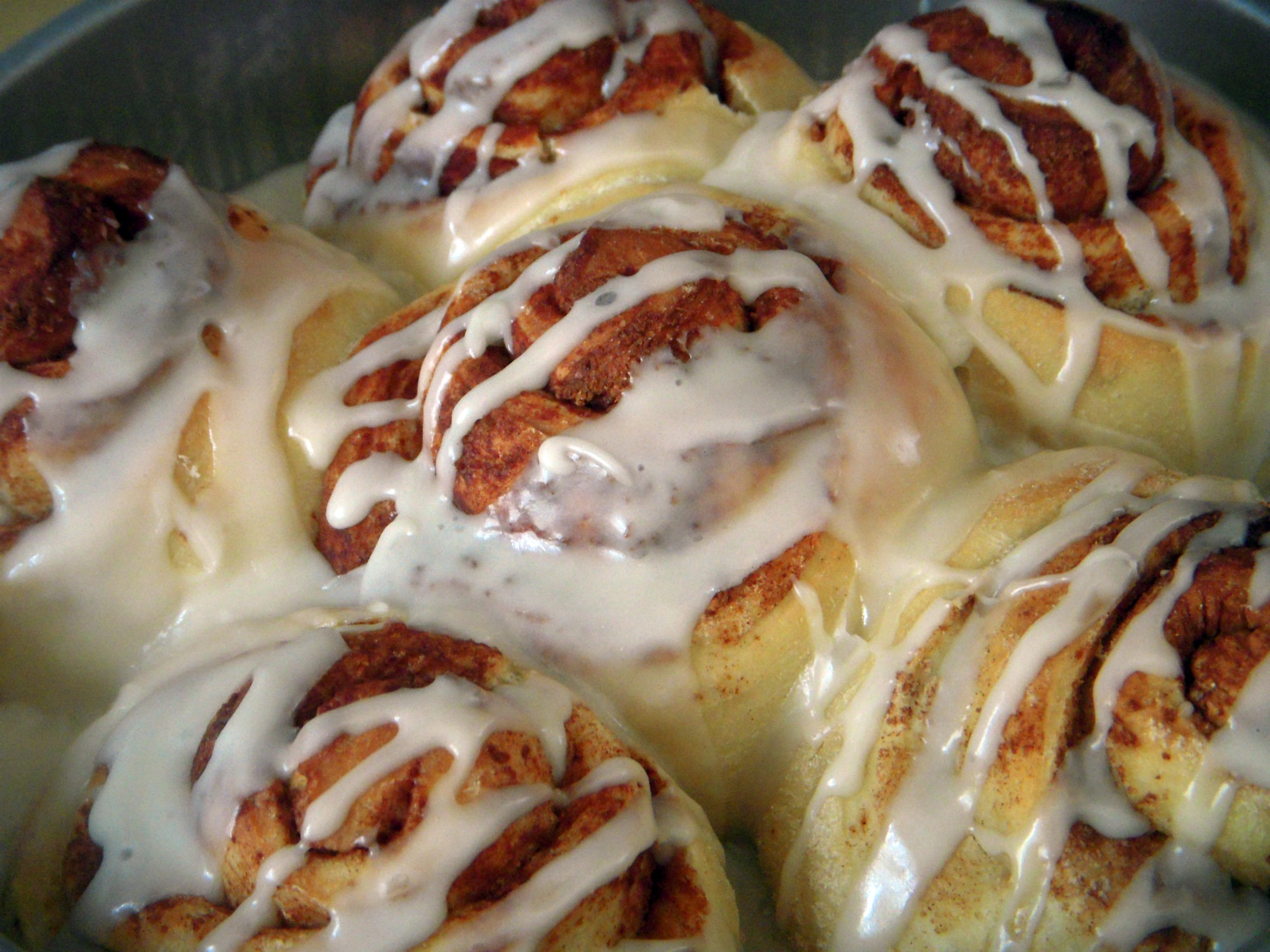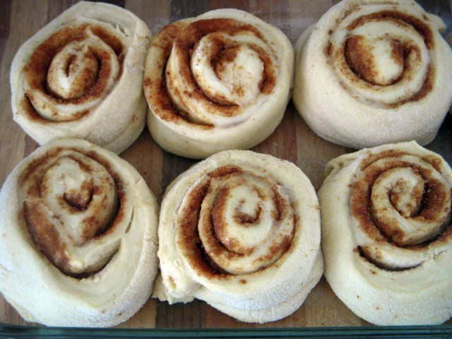 The dough gets covered with melted butter and a cinnamon sugar mixture, gently rolled up, and sliced into sections. Place them in a pan with space between them and let them rise for an hour or so – their edges will probably just be touching after rising. After baking and frosting, all that’s left to do is enjoy these, and I’m betting you will. It’s hard to beat a warm cinnamon roll right out of the oven!