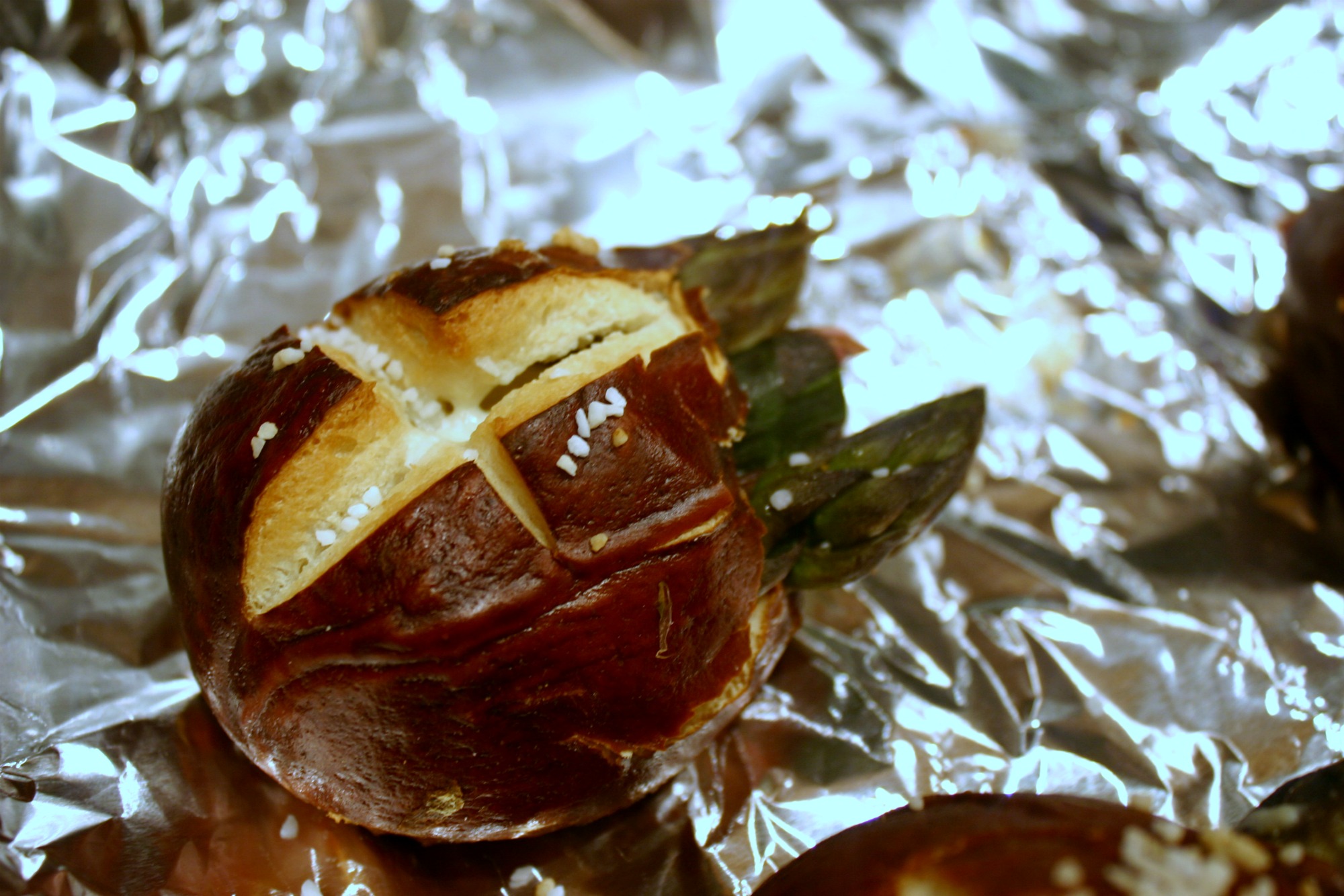 Cut a slit in the top of each roll and pull out some of the bread from the center. Fill each roll with the white sauce. Stick the asparagus spears into the sauce and place on an aluminum foil lined baking sheet. Bake until toasty and bubbling about 10 minutes.