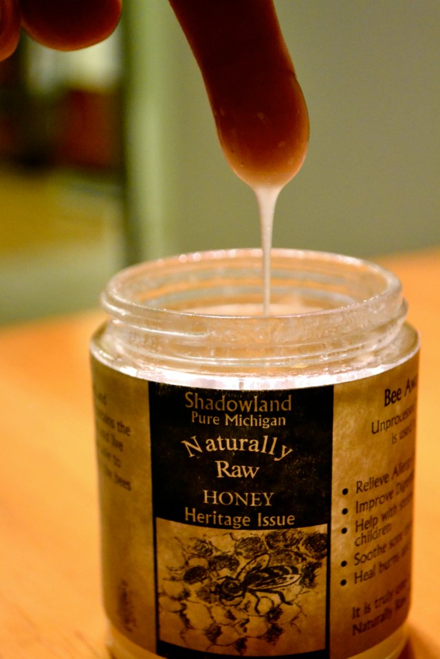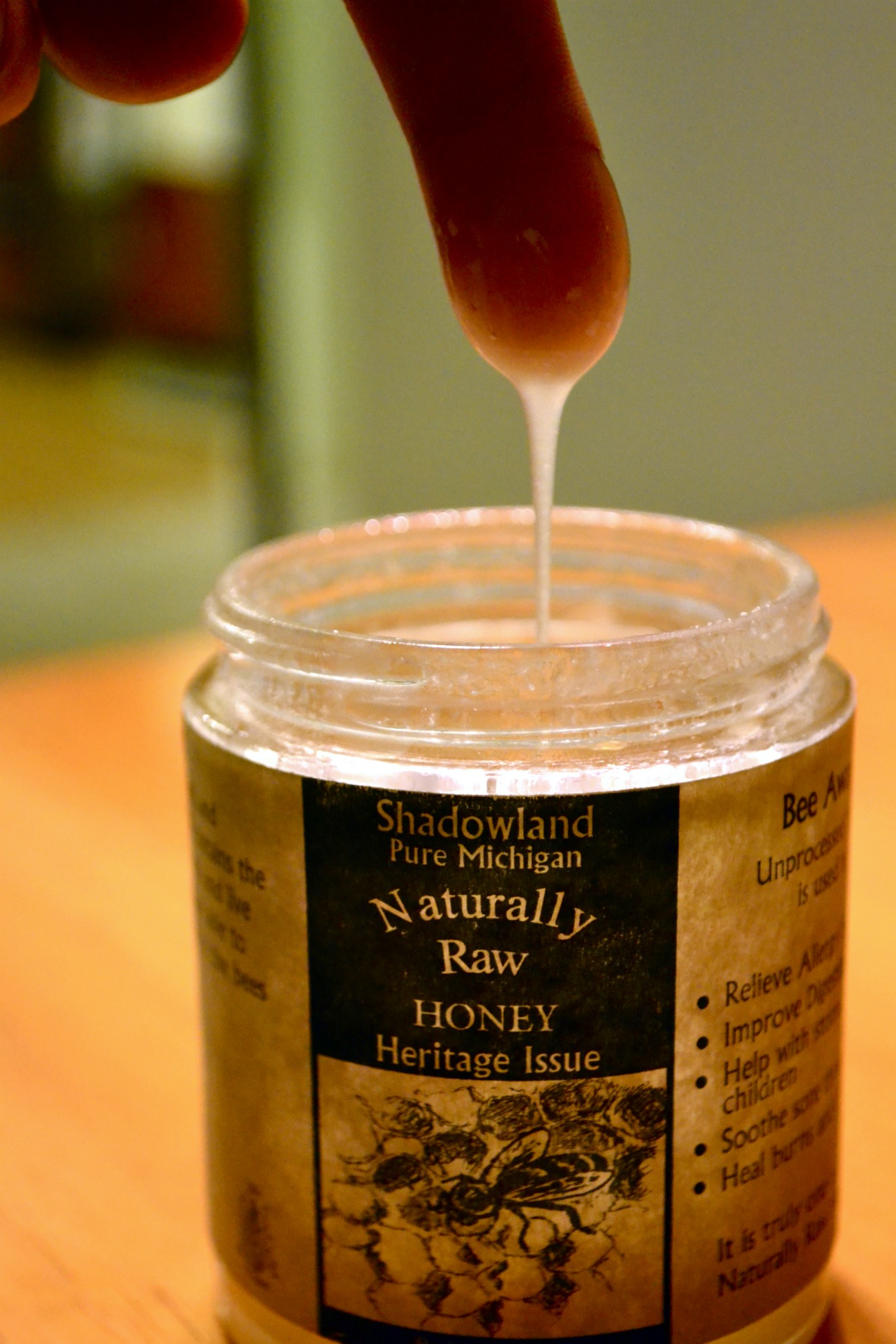 On a recent visit to the Sara Hardy Farmers Market in Traverse City, Michigan, I was asking Shadowland Honey about the different varieties of honey they had to offer. When I asked the difference between raw and processed honey, I assumed I’d get an, “Oh it’s just a taste thing, some people prefer the taste and crystalline texture of the raw.” And while that answer was, in part true, the second part of the answer sent me lunging for the honey like Winnie the Pooh to a honeycomb. I learned that raw honey is honey that is still in its natural state; it is unfiltered and unprocessed. What this means for us eaters of raw honey is that we are ingesting tiny bits of pollen, propolis (the resin mixture that bees use to seal up their hives), small pieces of honeycomb, and living enzymes with every sweet spoonful we lather onto our toast.