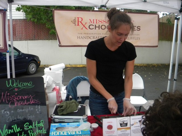 Four years after it began, Missionary Chocolates is now a thriving small business run by Melissa and her sister, Vanessa, and supported by volunteers. At farmers markets, their stall is surrounded by curious chocolate lovers, dedicated fans, and children with their weekly allowance. Her flavors change seasonally (Pumpkin Pie is coming up!), but include Vanilla Salted Caramel, Dark Chocolate Delight, Trailhead Espresso, Glorious Ginger, Spicy Cinnamon Chipotle, and her award-winning Meyer Lemon Explosion. She also makes chocolate-covered pretzels.