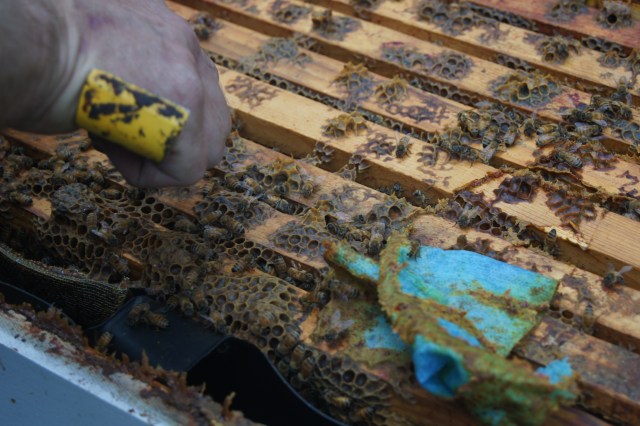 Mark doesn’t have an inflated sense of his role as an apiarist, but it’s obvious by the end of the tour that the current food infrastructure is entirely contingent upon the honeybee. Large monoculture crops, like the California almonds, cannot survive without them. If the almonds were left to our native pollinators (such as moths) roughly 70% of the crop would not bloom. In the hierarchy of pollinators, we’ve artificially placed honeybees at the top. This shaky hegemony has placed our system at risk. The current agricultural infrastructure is further compromised by the Colony Collapse Disorder, a mysterious species wide disease. Every year Mark sees at least 30% of his bee population die. This statistic mirrors the national average. Bees have never suffered from our indifference, but are now suffering under our acute attention.