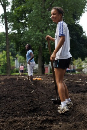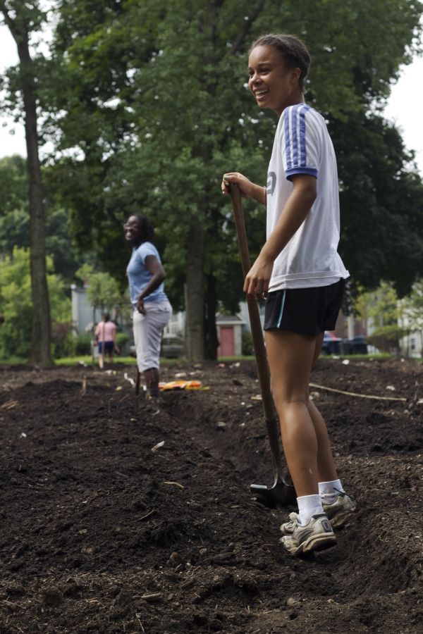ReVision Urban Farm began as a small garden in 1990 alongside a shelter for homeless mothers that is now the ReVision Family Home. Originally called ReVision House, the program began as a very small grassroots effort to positively impact the lives of young homeless mothers and their children. With the purchase of three abandoned lots across the street, a plot of land was reclaimed in the heart of Boston to become the ReVision Urban farm that is in operation today. When I visited the farm with fellow Food Warrior Rebecca Bilodeau, we were able to see one of the new plots of land where volunteers and farm staff were constructing raised beds and hard at work.