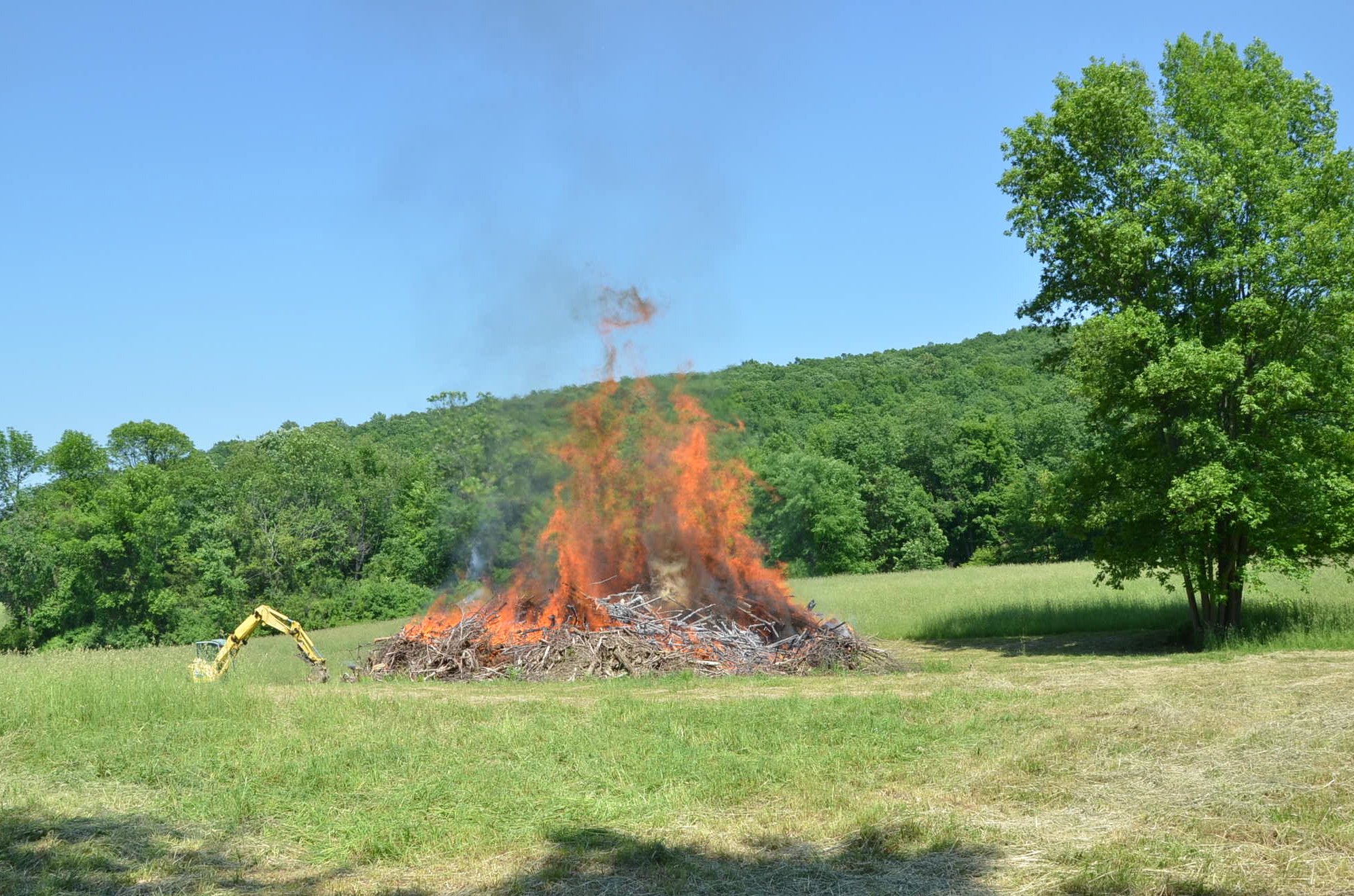 Bacchus is not a controllable god (as you may remember from your Euripides in school) – and neither, it turns out, is fire. My lesson from burning a pile of wood 25 feet wide and 15 feet tall is this – don’t have any guests nearby but do have an excavator.